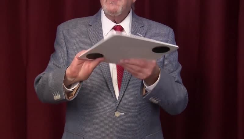 Sized for maximum visibility, nine and a half inches square (24 cm) with two and a quarter inch (5.7 cm) diameter spots. These are the maximum sizes for visibility without the prop becoming unwieldy and will play to a 500 seat theater as easily as it does close up in a Zoom show.