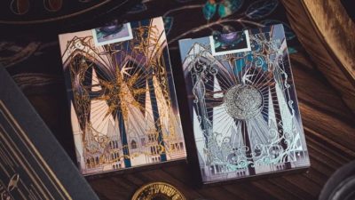 On the Enchanter playing cards, a magical world of magic is constructed. The cards are divided into the Day version and the Night version, representing the Witch Academy in the day and night respectively. The design of the tuck box is very much in the flavor of the Western magic world. The large area of purple is the main color, rendering a mysterious sky scene. The two witches are wearing wizard robes and seem to be plotting a mysterious mission. There are also exquisite hot stamping lines on the tuck box, which not only provides a craft bonus, but also adds new elements to the magic world. The back of the two versions of the Enchanter playing cards in the picture presents various buildings in the magic world with a 360-degree spherical perspective. The characters on the two Jokers in the picture are the founders of the Witch Academy, who teach girls magic abilities and let them exercise and grow.