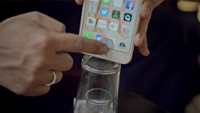 – Or, a marked finger visually penetrates a solid glass, landing in a shot glass inside the larger glass!