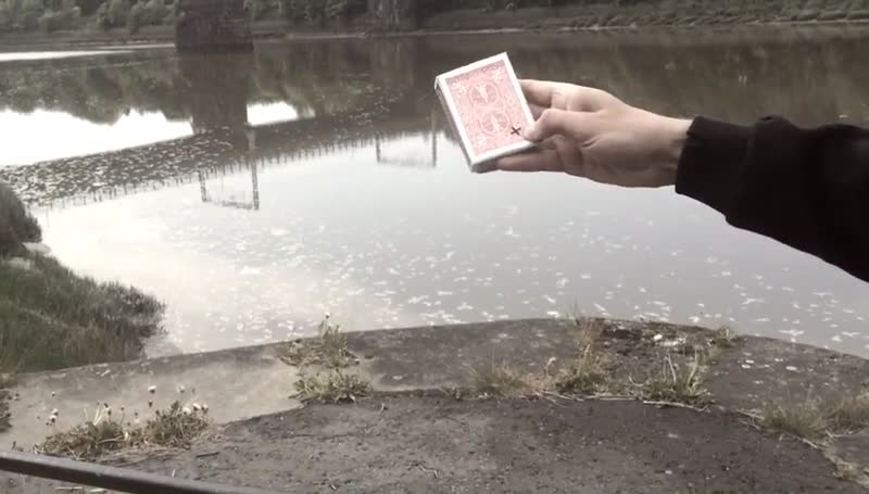 A cross is drawn on the top corner of a selected and signed playing card. Then the magician places the signed card between the cellophane and the box, and the cross visually travels from one corner of the card to another. The card is removed and handed out for examination.