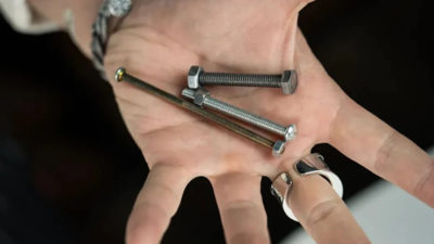 You then pinch one end of the bolt with your fingers. Without touching the nut at all, the nut starts to rotate on its own and eventually unscrews completely from the bolt.