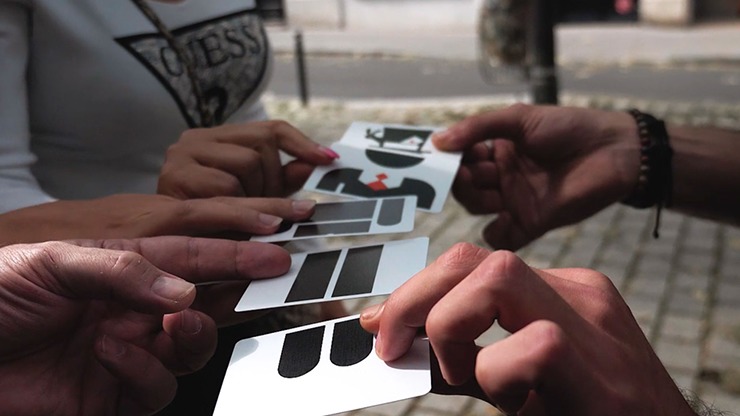 The magician introduces a rather special set of cards because each card represents a little man with the first letter of the word below (G for Guitarist, P for Painter, C for Clown, etc.).