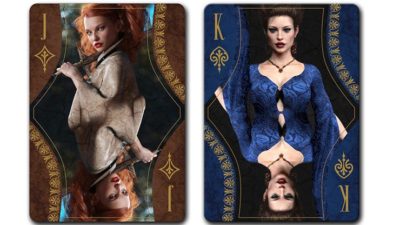 Rubynis Royal Blue Seal Playing Cards, designed by Sixty Four Playing Cards, is a unique and elegant deck of playing cards for collectors, where the court and the cards are all created with an original design. It is a limited and numbered edition. This version is wrapped in Black paper with a custom blue wax seal. A completely handmade work. The tuck case is very luxurious with embossing and foil. The numbered cards are delicate, and this worn background reinforces their medieval inspiration. The back shows a traditional intricate design made with natural shapes.