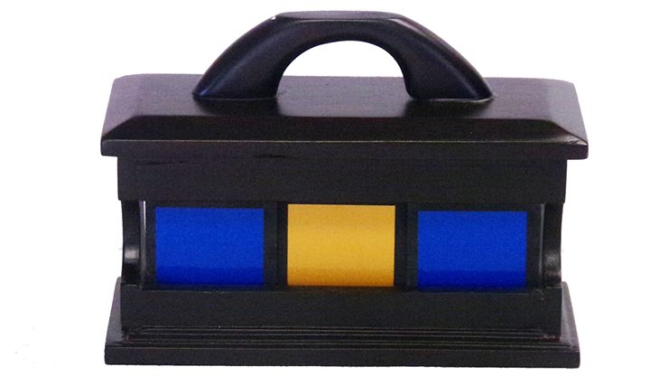 Three examined wooden blocks, two blue and one yellow, are placed into a wooden cabinet which has no front or back. The yellow block between the blue ones. The two blue blocks are squeezed together, and the yellow block gets smaller and smaller until it vanishes completely! In the end the two blue blocks can be given out for examination, again.