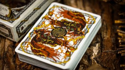 The collector’s display box matches the aesthetic of the playing cards’ tuck box, exuding a sense of majesty and luxury. The appearance, including the text, is foiled, shining with a metallic luster.