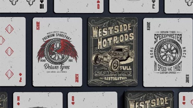 Westside Hotrods Playing Cards featuring vintage hot rod designs, “Westside Hotrods” branding from Los Angeles, specializing in custom hotrod restoration and parts.